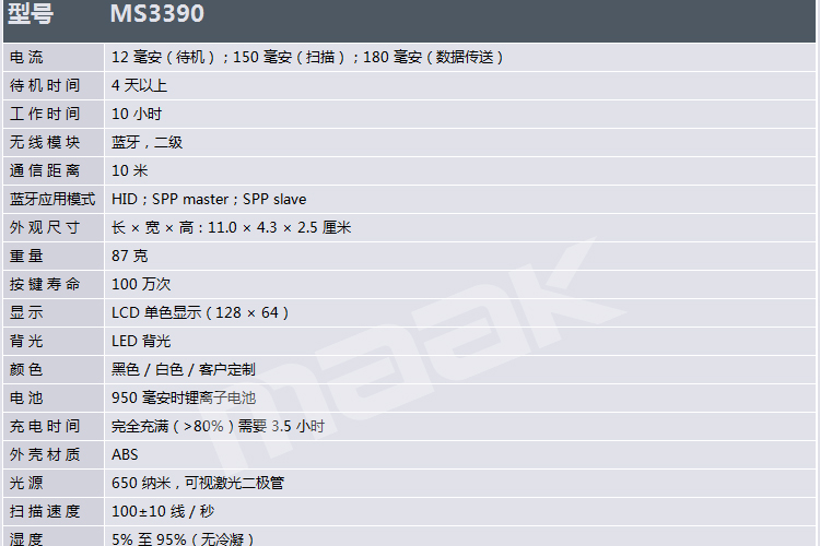 ◆ 配備1900mAh鋰電池,可連續(xù)工作9小時(shí)(每5秒掃描及傳輸一次),待機(jī)12天