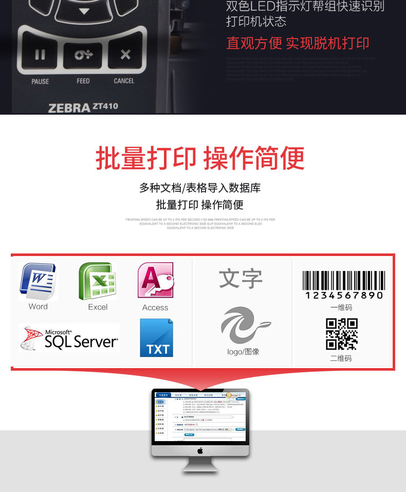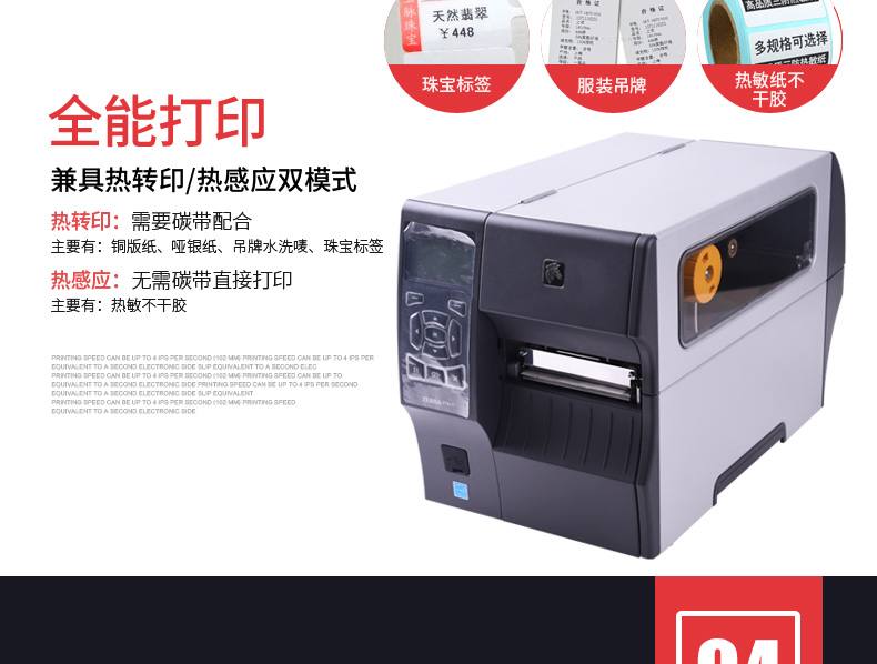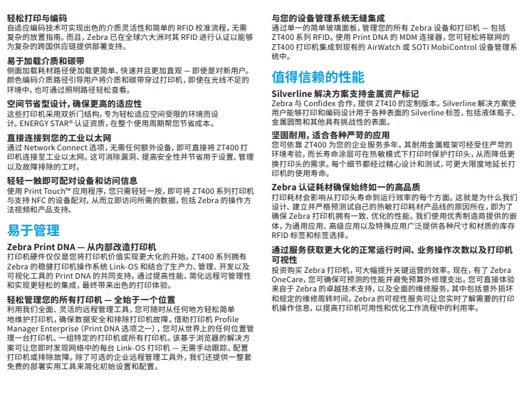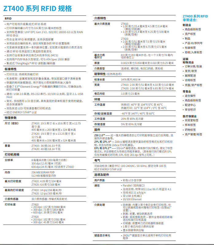 ZT410 RFID 工業(yè)打印機(jī) ZT410 RFID 打印機(jī)/編碼器采用彩色或黑白顯示屏,打印寬度為 4 英寸,打印速度高達(dá)每秒 14 英寸。此外,它還為小標(biāo)簽應(yīng)用提供高分辨率 (600 dpi) 打印功能,采用自適應(yīng)編碼技術(shù),可實(shí)現(xiàn)卓越的介質(zhì)靈活性,并簡(jiǎn)化了 RFID 校準(zhǔn)流程。安裝操作說明視頻、手冊(cè)及驅(qū)動(dòng)程序ZT410 RFID 支持行業(yè)應(yīng)用 醫(yī)療保健 交通運(yùn)輸