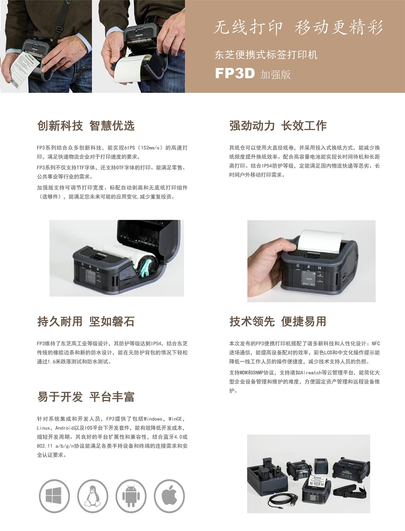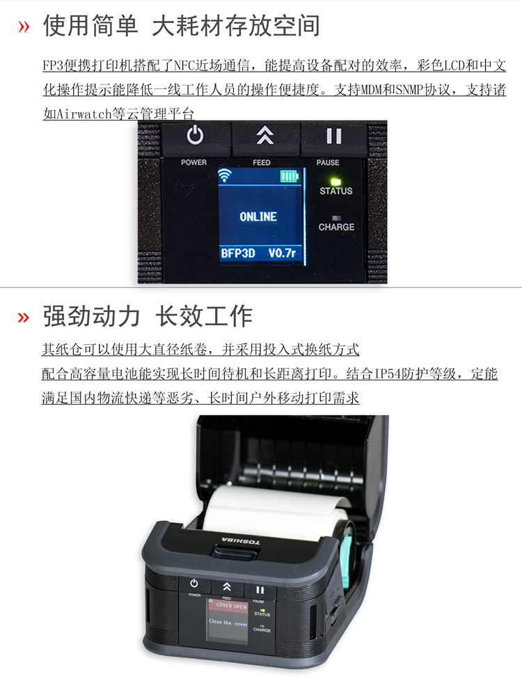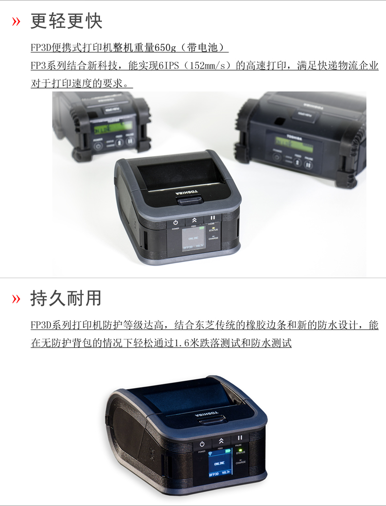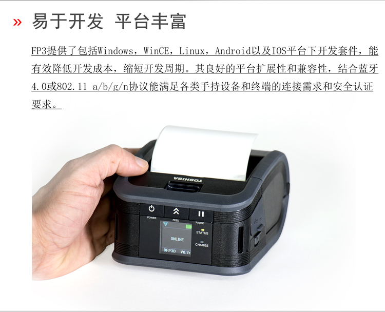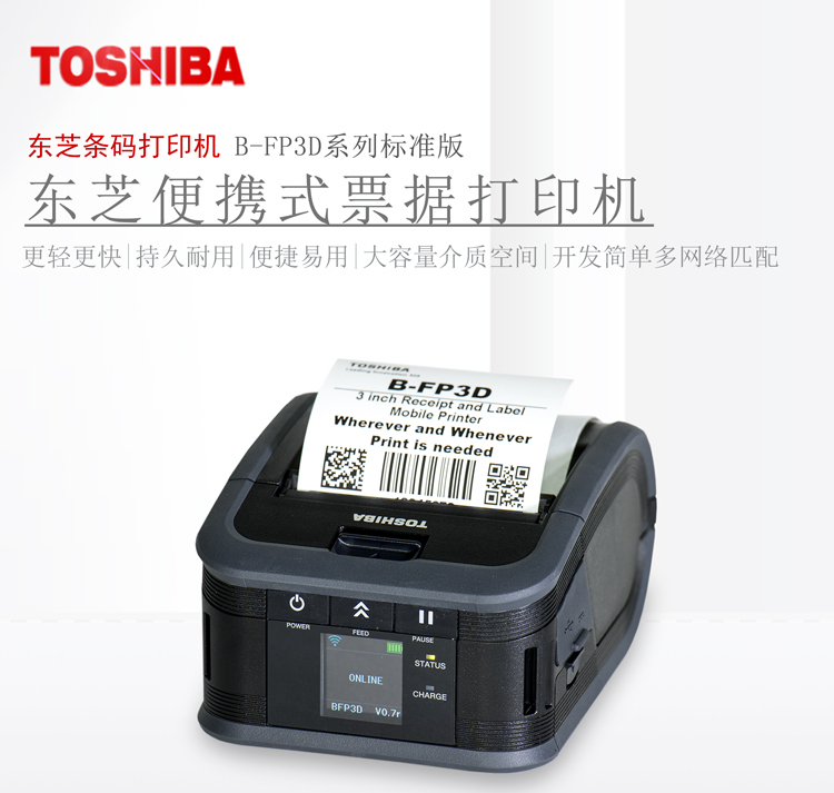 東芝將創(chuàng)新移動打印技術(shù)帶到你的手中,F(xiàn)P3D加強版3寸便攜式熱敏打印機,擁有6IPS(152mm/s)高速打印、彩色中文液晶屏、自動剝離等技術(shù),蘊含著東芝對于便攜性、可靠性、高性能和創(chuàng)新性的承諾,滿足各類便攜打印的應(yīng)用需求。