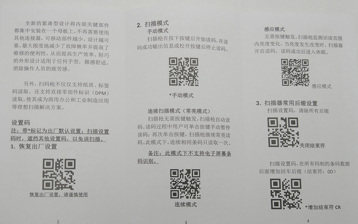 1 .恢復(fù)出廠設(shè)置連續(xù)掃描模式(常亮模式)掃描槍無(wú)需按鍵觸發(fā),掃描槍自動(dòng)讀碼。讀碼過(guò)程中用戶可單擊按鍵手動(dòng)暫停讀碼;再次單擊按鍵,掃描槍繼續(xù)常亮讀碼。此模式下,連續(xù)相同條碼只讀取一次。關(guān)閉結(jié)束符備拉廷衛(wèi)比摸式王王直盆生區(qū)通崖盜碼識(shí)別。掃描設(shè)置碼,在所有碼制的條碼數(shù)據(jù)后面增加回車后綴